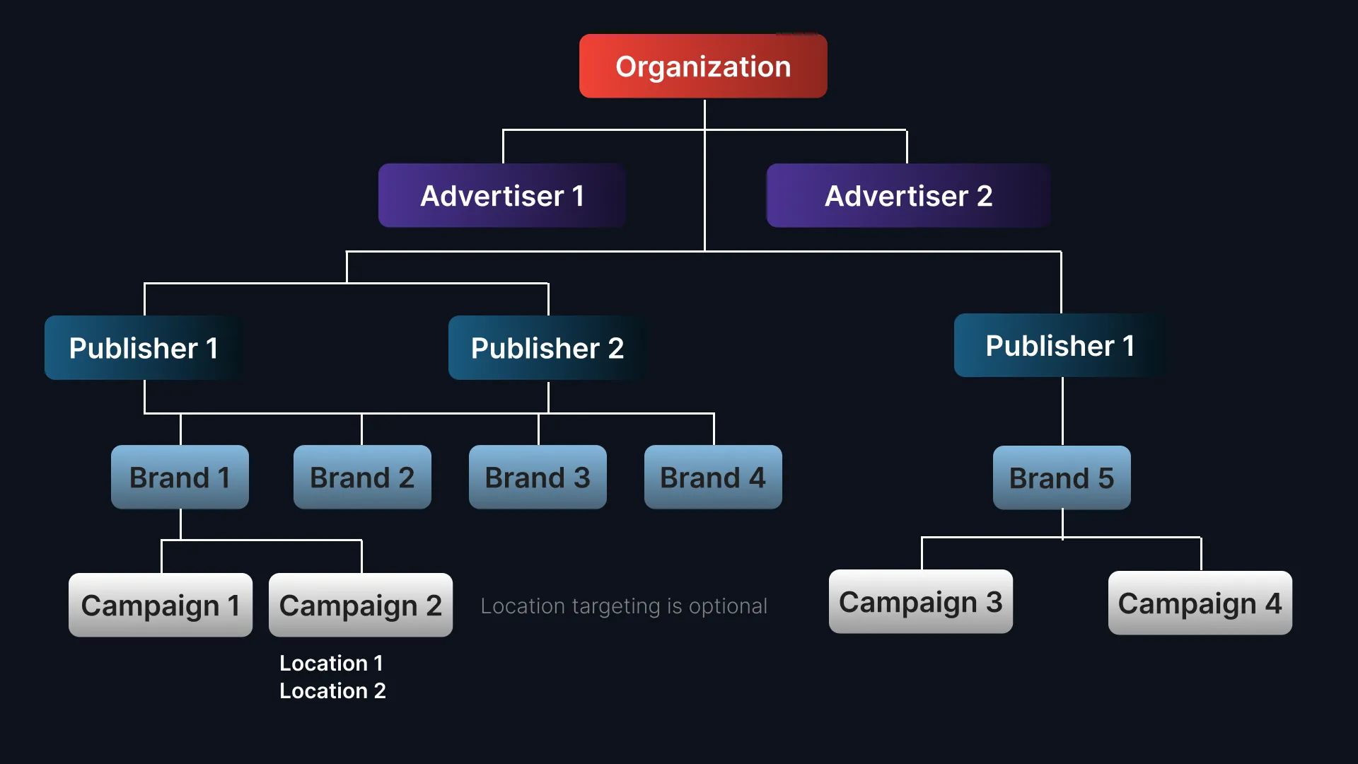 pentaleap provides an http based rest api to support integrations the endpoints described in this documentation are detailed with parameters and further information in the respective section for each this is an overview of what each endpoint is used for and some best practise for users of the endpoints access to the endpoints is dependent on each partner's use case, so not all endpoints are relevant for every partner organization, publisher, site and ad unit these endpoints describe how a retailer is set up and the available ad units (formerly called ad grids) they run on their properties pentaleap supports both single and multi publisher retailers as standard and will provide an organisation id to all new retailer partners these might be different banners within one market or across geographies brands and advertisers can be shared across organizations for easy campaign setup and management so advertisers can manage multi retailer campaigns seamlessly publishers are distinct retailers within an organization, typically a banner within a retail group the publisher endpoints allow users to retrieve information about each publisher including the products and brands available under each publisher and the id of each publisher, which is used for further operations each publisher also has one or more sites under them, for example a retailer may have different sites set up for desktop and app, or for different geographic markets site ids and names are retrieved from the sites endpoint each site is tied to a particular product feed (set up by the retailer and not relevant for the scope of this documentation), and each market (eg us, gb, mx) has its own product feed and currency ad units are the ad units a retailer has set up in their various publishers, markets and sites and which are optionally available for ad group targeting the ad unit endpoint retrieves a list of available ad units for a publisher and site while each ad unit is named, the locations and page positions are most relevant for any targeting purposes product the product endpoint retrieves sku level information for a specific publisher and site it can be used to see which products are present in the retailer product feed for sponsorship and inclusion in ad groups advertiser, campaign, ad group and spa ad group product these endpoints are used for advertiser, campaign, ad group creation and management via pentaleap's first party dsp, as well as reporting on ad group performance and status advertisers access is managed by the retailer and is designed to be flexible depending on the retailer setup an example structure is shown below retailers can grant access to all or a subset of available publishers, and retailers also assign available brands to each advertiser within and across publishers advertisers create ad groups within one publisher at a time, but can target any and all of their associated brands and products within an ad group ad groups can also target specific retailer locations such as search, homepage and category, but this is optional we recommend that ad groups default to targeting across all locations since pentaleap adserving technology is designed to place ads in the most relevant place in real time the advertiser endpoints allow users to retrieve (and if applicable create and update) advertiser information this includes the brands, locations and sites they are eligible to target multiple advertisers can be allocated against the same brand, but this will be listed specifically in the advertisers brandadvertiseroverlap field to avoid unwanted crossover of brands the campaign endpoints are used to create and report on campaigns for a specified advertiser this includes choosing markets and overall budgets for underlying ad groups nb targeting locations are available within the ad group setup options, however we typically recommend to target all locations by default, as pentaleap relevancy technology specialises in only placing ads where they are naturally relevant to the customer's need publisher reporting and reporting status for users with publisher level access, these endpoints are used to create retailer level ad group reports at granular and aggregated levels for specified dates the reporting status endpoint returns the last update time for reporting so users know the last reported data point to support daily or regular calls to the reporting ad groups a campaign can have any number of underlying ad groups there are three kinds of ad groups spa display sponsored brand spa ad groups the spa ad group endpoints allow users to manage ad groups including locations to target, dates, budget settings, setting them live or pausing them as well as adding default bids spa ad group products endpoints are used to set and update product level bids and settings to optimise ad groups there are also endpoints to help filter and bulk edit settings for groups of products belonging to specific brands or categories display ad groups display ad group endpoints can be used to manage ad groups of type display or sponsored brand including targeting, budget settings, bids and dates the display ad group asset endpoints allow creating and editing creatives associated with an ad group display/sponsored brand ad groups need to be approved by the publisher before they can be served as ads